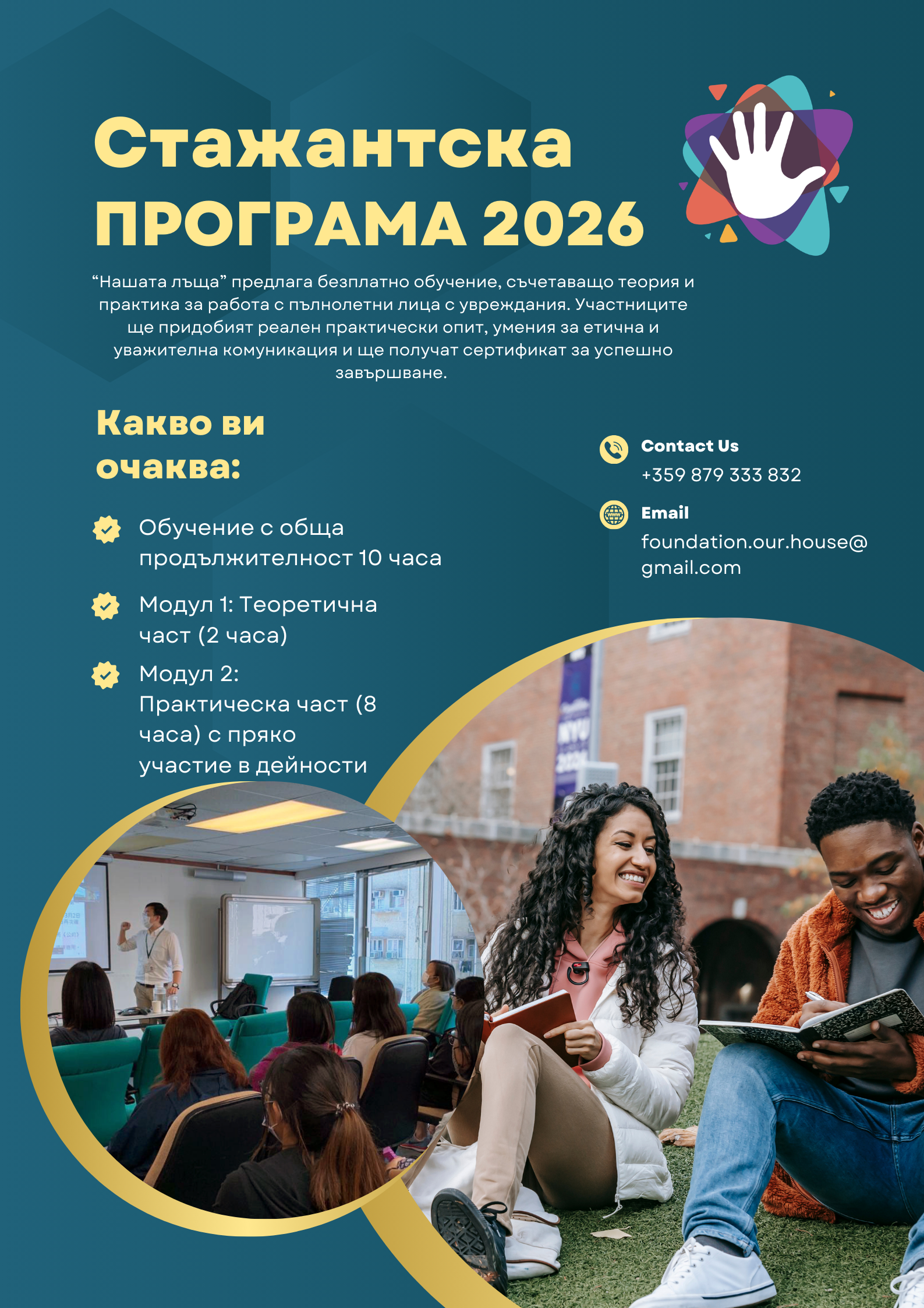 Работата с хора с увреждания изисква не само професионални знания, но и отношение, основано на уважение, разбиране и подкрепа. Именно затова стартираме стажантска програма „Ресурсно-ориентиран подход в подкрепа на хора с увреждания“, която има за цел да подготви доброволци за смислена и отговорна работа с пълнолетни лица с увреждания. Програмата е създадена като възможност… Повече
