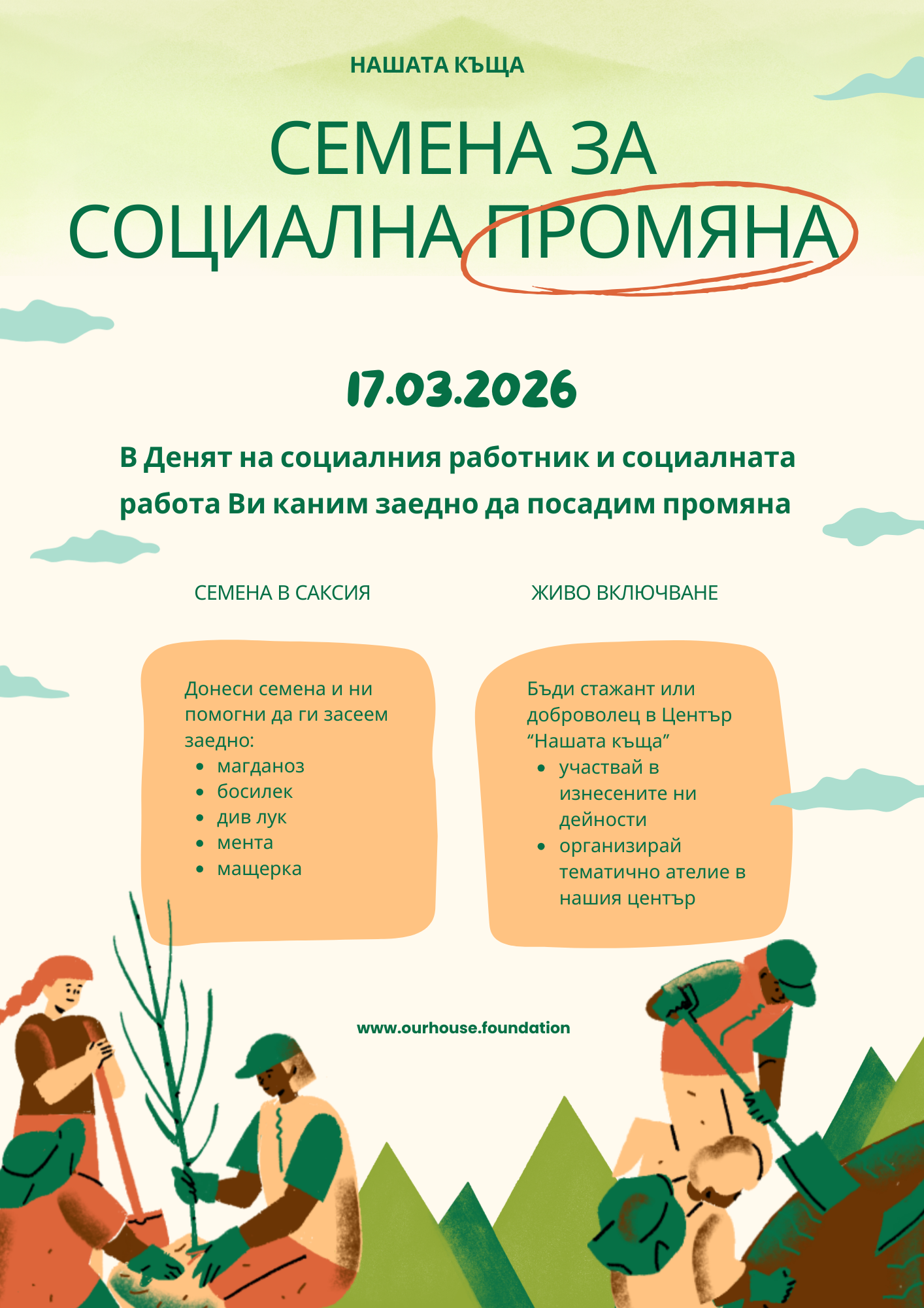 Фондация Център за социални услуги в общността „Нашата къща“ е учредена през месец септември 2021 година. Тя е плод на дългогодишна съвместна работа с различни групи от общността – семейства в риск, семейства на деца с множествo увреждания, специалисти в социалната сфера, доброволци, както и международни партньорски организации, които застанаха зад нуждата да бъде създадена организация, която да работи за осигуряване на равен достъп на общността до социални услуги , отговарящи на индивидуалните потребности на хората.